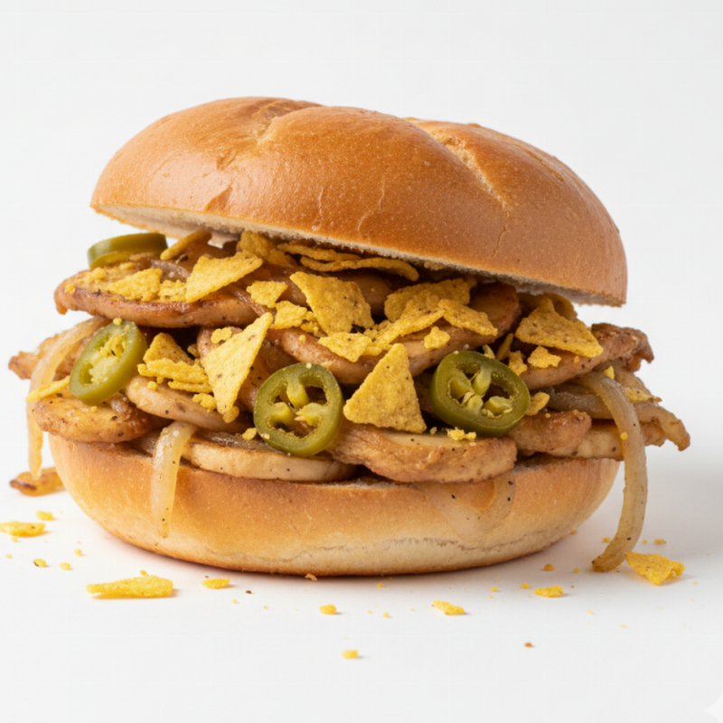 Kajzerka z pieczarkami i cebulką, serem chedar oraz dowolnymi dodatkami do wyboru (prażona cebulka, papryczki jalapenio, nachos chilli)- dowolny sos